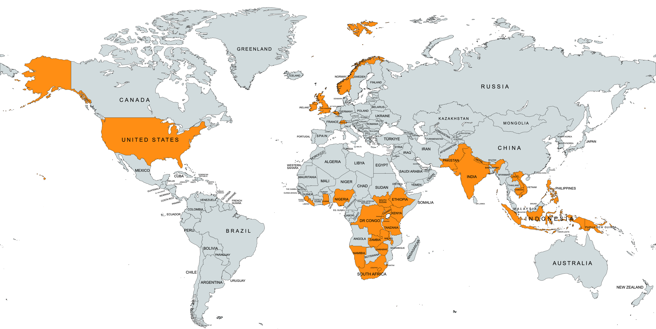 Ghana, Lesotho, Tanzania, Malawi, Zimbabwe, South Africa, Kenya, South Sudan, Ethiopia, Nigeria, Namibia, Nepal, Cambodia